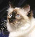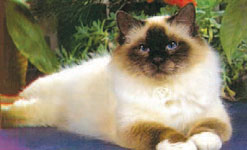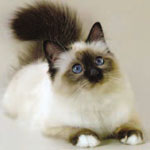 Священная бирма – кошка среднего размера. По окрасу напоминает сиамскую, а шерстью похожа на перса. У неё среднего размера ушки и большие синие глаза. Окрас шерсти может быть разный, но всегда с ярко выраженными пятнами и «перчатками» на лапках. Кошки этой породы очень ласковые и приветливые, сильно привязаны к дому и хозяевам